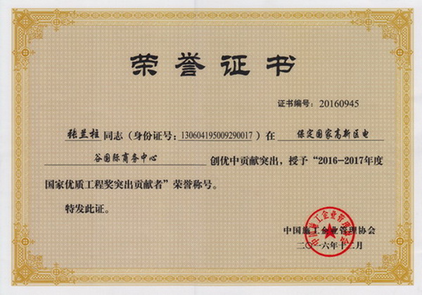 張?zhí)m柱同志以他杰出的工作業(yè)績被各級領(lǐng)導(dǎo)機(jī)關(guān)授予:全國、河北省、保定市建筑業(yè)優(yōu)秀企業(yè)經(jīng)理;優(yōu)秀企業(yè)家;優(yōu)秀共產(chǎn)黨員;優(yōu)秀黨務(wù)工作者;優(yōu)秀思想政治工作者;安全生產(chǎn)、工程質(zhì)量管理先進(jìn)個(gè)人;河北省優(yōu)秀經(jīng)理管理者;河北省建設(shè)系統(tǒng)勞動(dòng)模范;河北省勞動(dòng)模范等榮譽(yù)稱號
